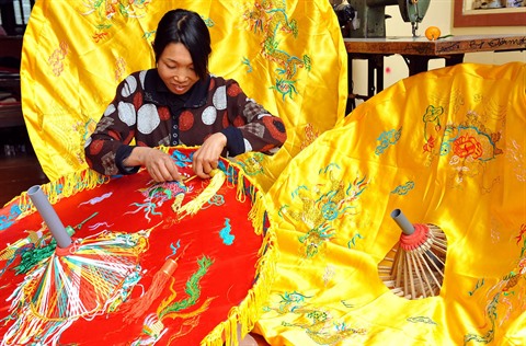 | Dông Cuu était autrefois réputé dans tout le pays pour ses costumes brodés pour les tenues royales et officielles. |