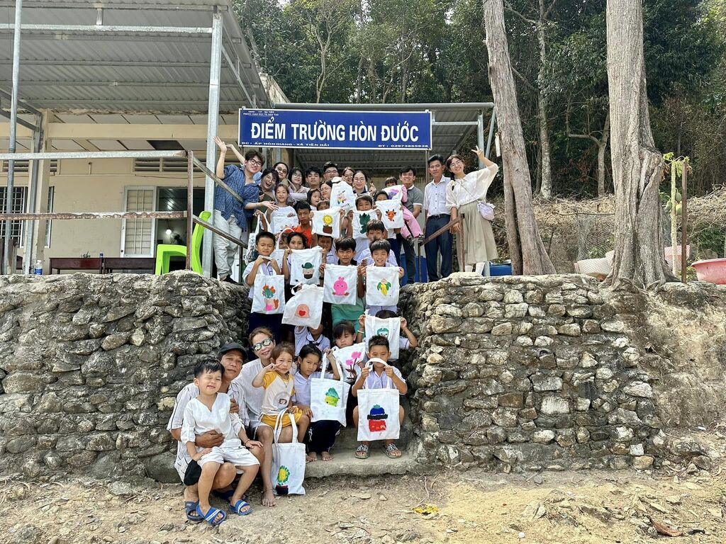 Puis, au début de l’année 2024, Đồng Kiến a élargi ses activités avec le projet “Đảo Kiến Tạo” saison 1 à l’archipel Hải Tặc, province An Giang. Le groupe a organisé l’activité *”Décorer des sacs pour protéger l’environnement”*, permettant aux enfants d’exprimer leur créativité tout en prenant conscience de l’importance de préserver la nature. Đồng Kiến a également offert une bibliothèque et du matériel scolaire aux élèves de l’École primaire et secondaire Tiên Hải (Hòn Đước), appartenant à l’archipel de Hải Tặc. Ce projet a ouvert de meilleures opportunités d’apprentissage et a éveillé chez les enfants la passion d’apprendre ainsi que le désir de découvrir de nouveaux savoirs.