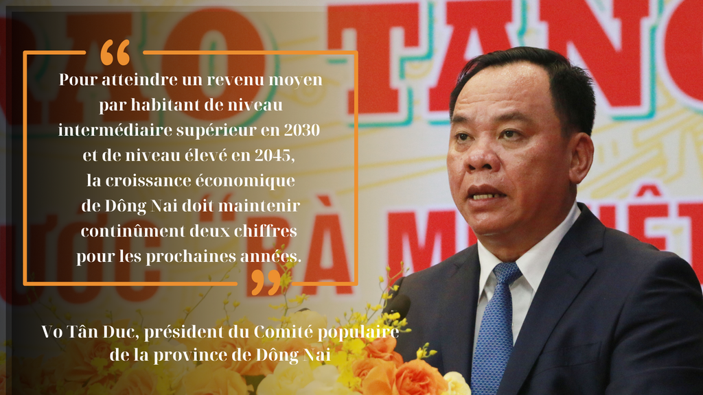 "Pour atteindre un revenu moyen par habitant de niveau intermédiaire supérieur en 2030 et de niveau élevé en 2045, la croissance économique de Dông Nai doit maintenir continûment deux chiffres pour les prochaines années", a souligné Vo Tân Duc, président du Comité populaire provincial. En particulier à compter de cette année, la province s’est fixée comme objectif une augmentation du produit intérieur brut régional (GRDP) d’environ 12,4% par an.