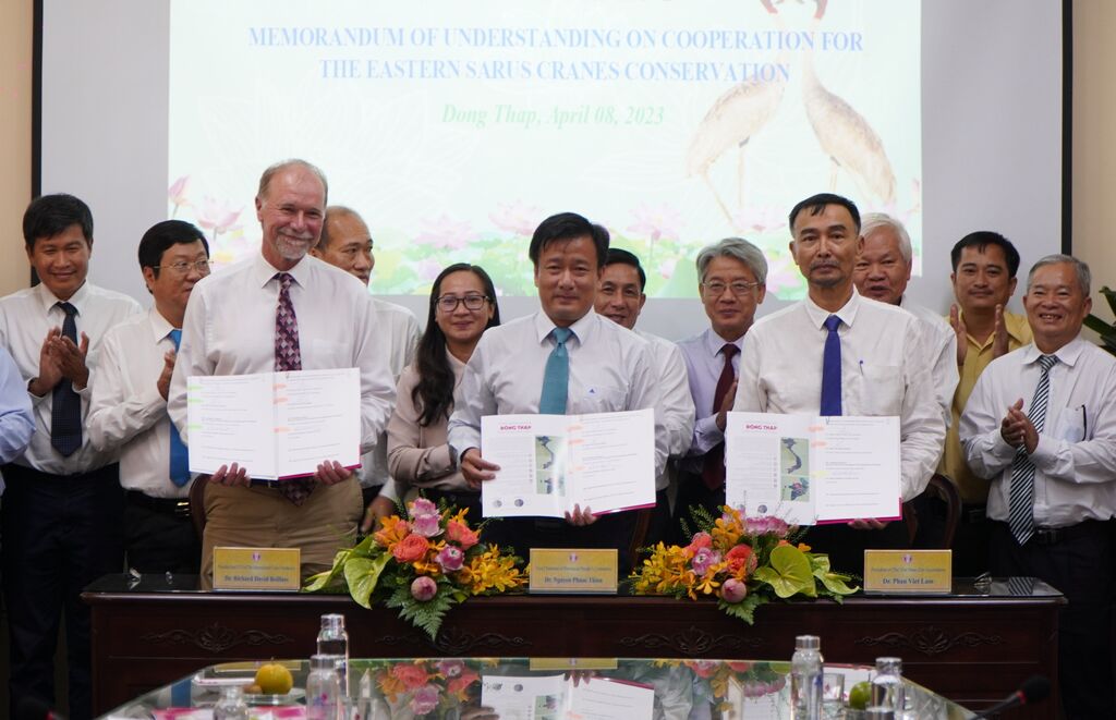 | Signature de l'aide-mémoire sur la coopération dans la conservation des grues à tête rouge, le 8 avril dans la province de Dông Thap. |