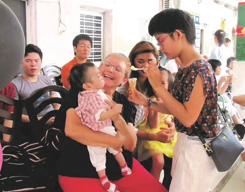 | Agnès Munier-Michel et sa fille Vy s’occupent d’un nourrisson. |