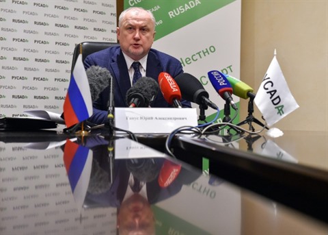 | Le directeur de l'Agence antidopage russe (Rusada) Youri Ganus en conférence de presse, le 22 janvier à Moscou. |