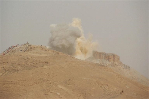 | De la fumée s'élève au-dessus de la citadelle de Palmyre, en Syrie, le 25 mars. |