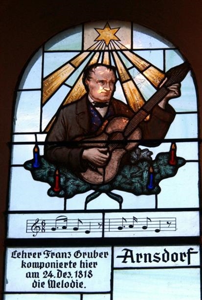 | Portrait du compositeur de "Douce nuit", Franz Xaver Gruber, sur un vitrail de la chapelle du village d'Oberndorf, près de Salzbourg. |