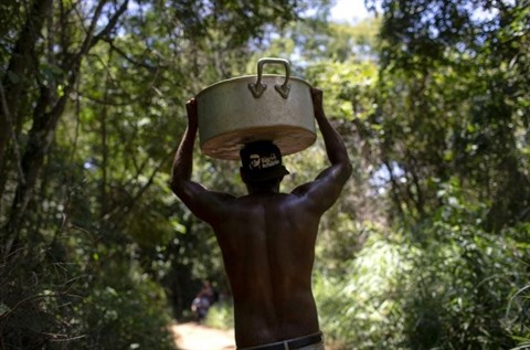 | Un membre de la tribu Pataxó porte une immense casserole et se dirige vers son village devasté par la rupture du barrage de Brumandino dans l'État du Minas Gerais, le 30 janvier 2019. |