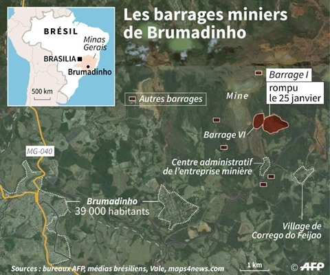 | Localisations des barrages miniers de la région de Brumadinho au Brésil. |