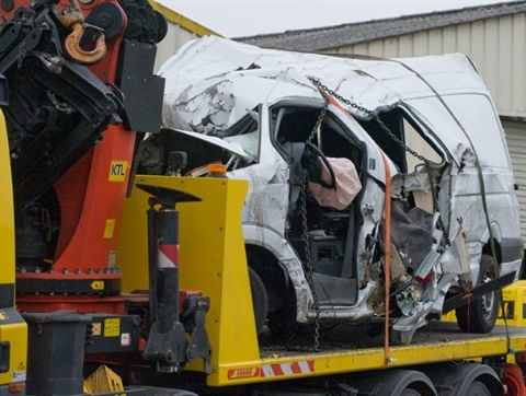| Le minibus accidenté le 25 mars à Montbeugny près de Moulins (France) emmené sur une remorque. |