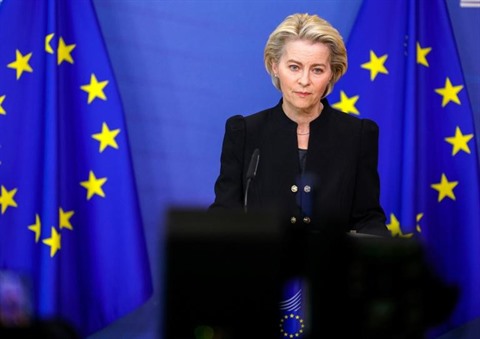 | La présidente de la Commission européenne, Ursula von der Leyen, fait une déclaration après la mort du président du Parlement européen, David Sassoli, le 11 janvier à Bruxelles. |