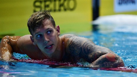 | L'Américain Caeleb Dressel après la finale du 100 m nage libre des Championnats Pan-Pacifiques, le 10 août à Tokyo. |