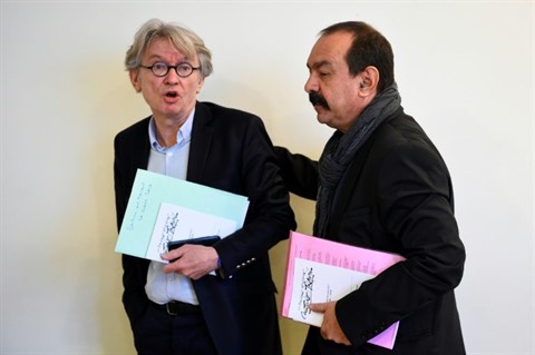 | Le secrétaire général de Force ouvrière, Jean-Claude Mailly (gauche), et le leader de la CGT, Philippe Martinez, lors d'une conférence de presse à Paris, le 29 mars. |
