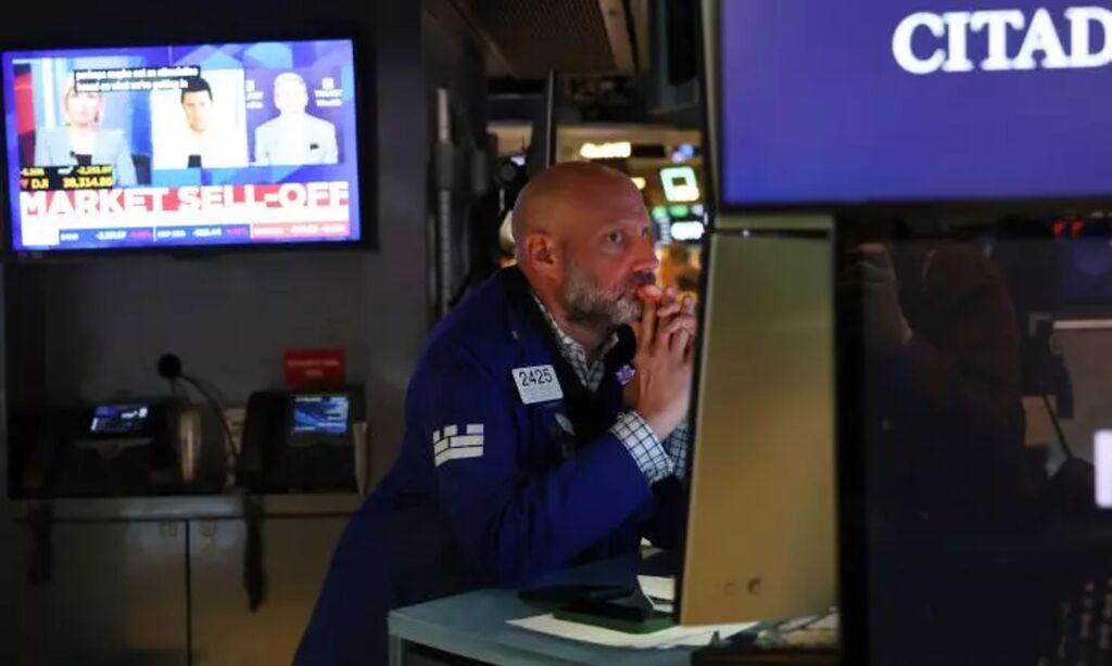 | Trader au New York Stock Exchange, à la clôture du marché le 4 avril 2025, avec une baisse de près de 6%. |