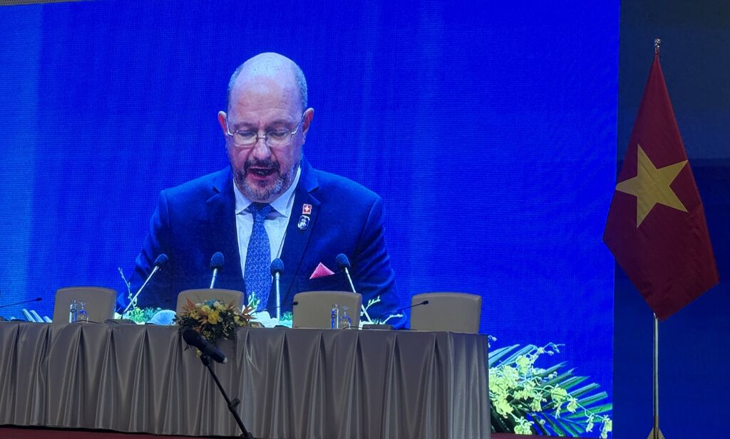 | L'ambassadeur de Suisse au Vietnam, Thomas Gass, s'exprime lors de la 2e session plénière de la cérémonie d'ouverture à la signature de la Convention de Hanoï, le 26 octobre. |