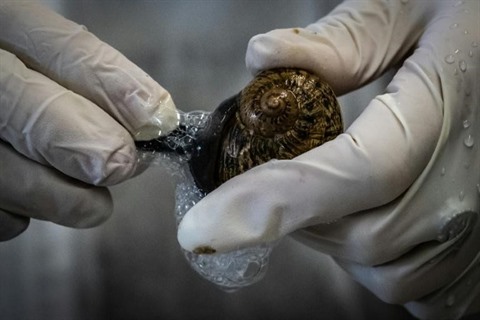 | Un héliculteur, éleveur d'escargot, extrait de la bave d'escargot destinée à la cosmétique, dans le village d'Albon, au centre de la France, le 28 juin. |