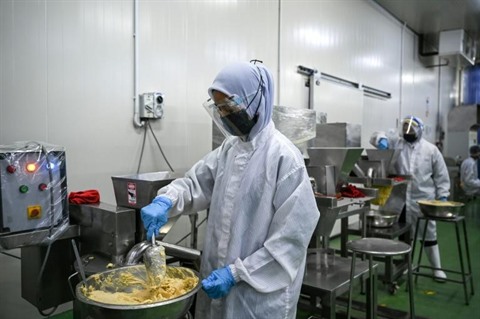 | Préparation d'une pâte de durian dans les installations la société agricole malaisienne Top Fruits Plantations à Batu Pahat, dans l'État de Johor au Sud de la Malaisie, le 26 avril. |