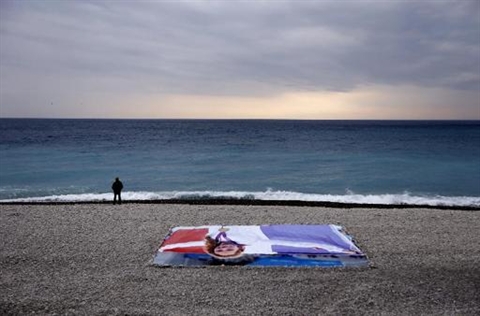 | Un portrait de Camille Muffat sur une plage de Nice, le 14 mars, en hommage à la nageuse tuée dans un accident d'hélicoptères en Argentine. |