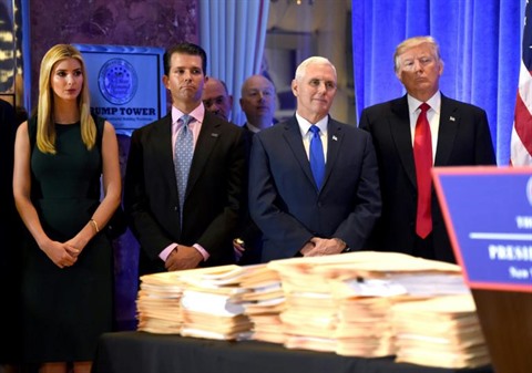 | À la droite de Donald Trump, son vice-président, Mike Pence, son fils Donald Jr et sa fille sa fille Ivanka, le 11 janvier à New-York. |