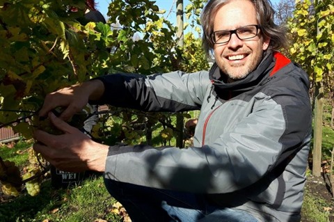 Pour Pieter Bakens, bottes jaunes en caoutchouc et pince coupante à la main, le vignoble urbain communautaire de La Haye ("De Haagse Stadswijngaard") est une occasion de rencontrer d'autres passionnés de vin comme lui mais aussi "un beau projet multiculturel".
