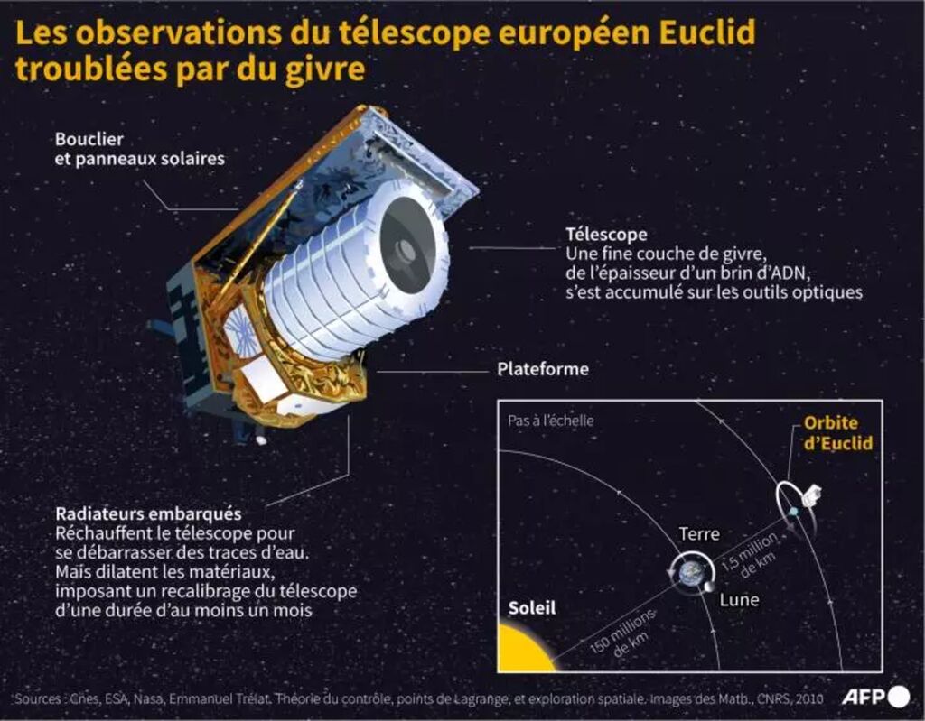 | Fiche du télescope spatial européen Euclid, dont les instruments d'optiques sont perturbés par du givre. |