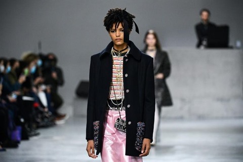 La collection est "très urbaine tout en restant sophistiquée, avec des blousons en tweed à manches en sweat-shirt, des broderies façon graffiti (...) des ensembles bermudas en tricot volumineux et des manteaux décontractés portés ouverts", souligne Virginie Viard dans la note d'intention du défilé.
