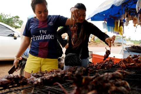 | Des clients choisissent leur rat grillé, le 8 août à Battambang, au Cambodge. |