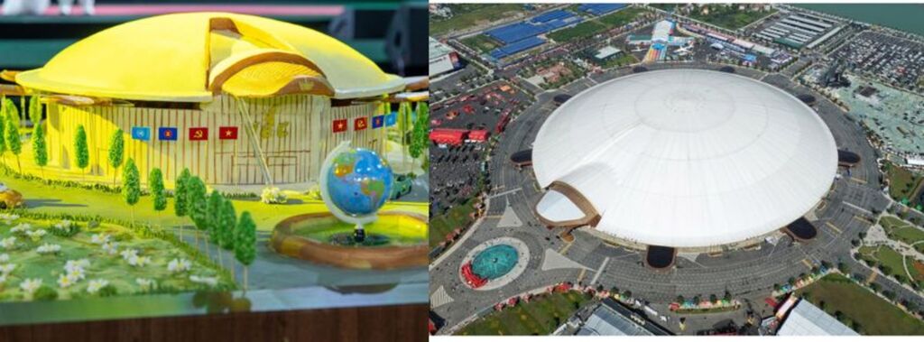 Cette œuvre spectaculaire, qui témoigne de la fusion harmonieuse entre tradition et modernité, a été conçue à l’échelle 1:10, mesurant près de 1,8 m de long, 2 m de large et 80 cm de haut. Pour la concrétiser, l’équipe de chefs professionnels du Lac Hông Palace à Haï Phong, guidée par l’artisane culinaire Trân Thi Hiên Minh et la section des chefs de Saïgon, a utilisé 410 kg de riz gluant à la momordique, coloré à partir de riz gluant jaune, ainsi que 100 kg de haricots verts. Chaque détail, des dômes aux motifs en passant par le paysage alentour, a été sculpté avec minutie, recréant fidèlement la structure du plus grand centre d’expositions d’Asie du Sud-Est, reconnu parmi les dix plus grands au monde.