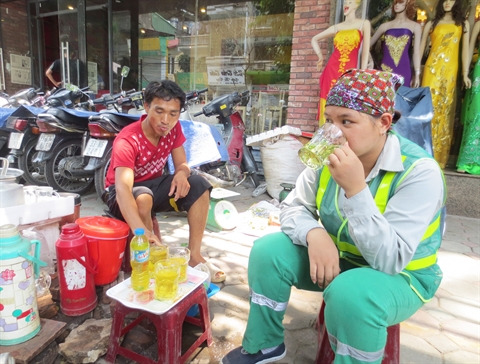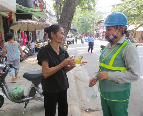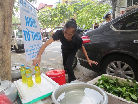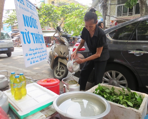 «Thé vert gratuit ! Veuillez venir boire !», invite de temps en temps une femme septuagénaire à haute voix. Assise au trottoir de la rue de Trân Xuân Soan, près du marché de Hôm, cette vieille dame distribue gratuitement du thé vert aux passants et notamment aux travailleurs pauvres depuis cinq ans. Elle est Nguyên Thi Hông Sen, 65 ans, domiciliée dans une petite maison de l’arrondissement de Hai Bà Trung à Hanoi.