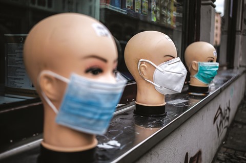 | Des masques médicaux exposés devant une boutique à Berlin. |