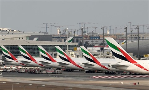 Les avions de la compagnie Émirates immobilisés à l'aéroport de Dubaï après la suspension de tous les vols passagers dû au nouveau coronavirus, le 24 mars. Photo : AFP/VNA/CVN |
