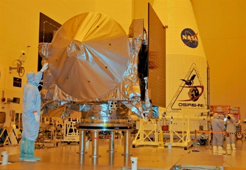 | Le vaisseau OSIRIS-REx, 880 kg sans le combustible et 3,2 m de haut sur 2,4 m de large, subit les derniers préparatifs dans un atelier du Centre spatial Kennedy, le 20 août en Floride. Photo : AFP/VNA/CVN |