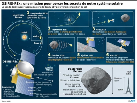 Le résultat de ce bricolage a pris forme au sein d'une mission de 800 millions de dollars de la NASA, baptisée OSIRIS-REx, et qui lancera le mois prochain son vaisseau vers l'astéroïde Bennu, dans le but de récolter des poussières vieilles de 4,5 milliards d'années pour tenter d'expliquer comment les substances essentielles à la vie, comme le carbone et la glace, sont arrivées jusqu'à la Terre.