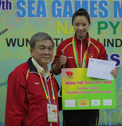| Le chef de la délégation vietnamienne, Lâm Quang Thành, aux 27e SEA Games félicite Duong Thuy Vi. |