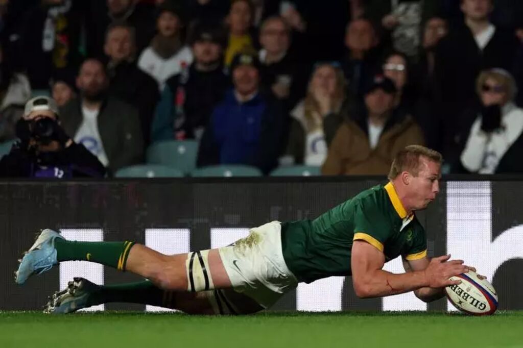 | Le Sud-africain Pieter-Steph Du Toit, désigné meilleur joueur du monde de rugby à XV, marque un essai contre l'Angleterre le 16 novembre au stade de Twickenham à Londres. |