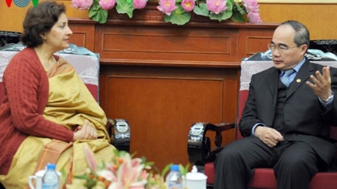 | Le président du Comité central du Front de la Patrie du Vietnam, Nguyên Thiên Nhân, et l'ambassadrice d’Inde au Vietnam |