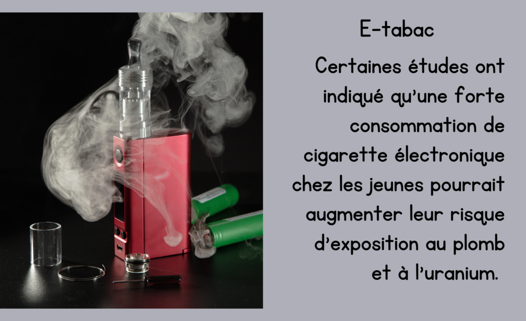 Certaines études ont indiqué qu'une forte consommation de cigarette électronique chez les jeunes pourrait augmenter leur risque d'exposition au plomb et à l'uranium.