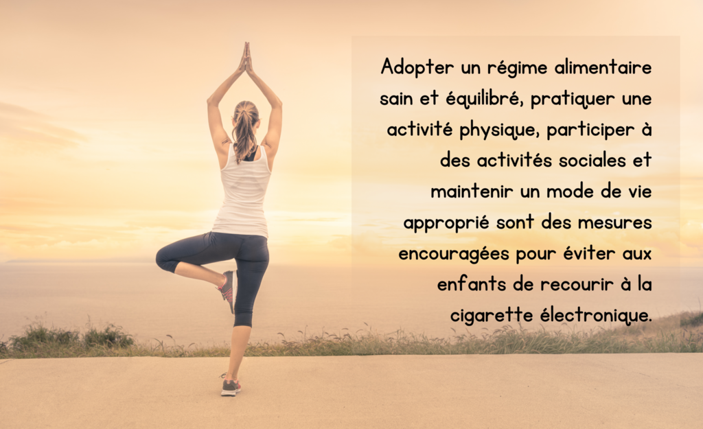 Adopter un régime alimentaire sain et équilibré, pratiquer une activité physique, participer à des activités sociales et maintenir un mode de vie approprié sont des mesures encouragées pour éviter aux enfants de recourir à la cigarette électronique.