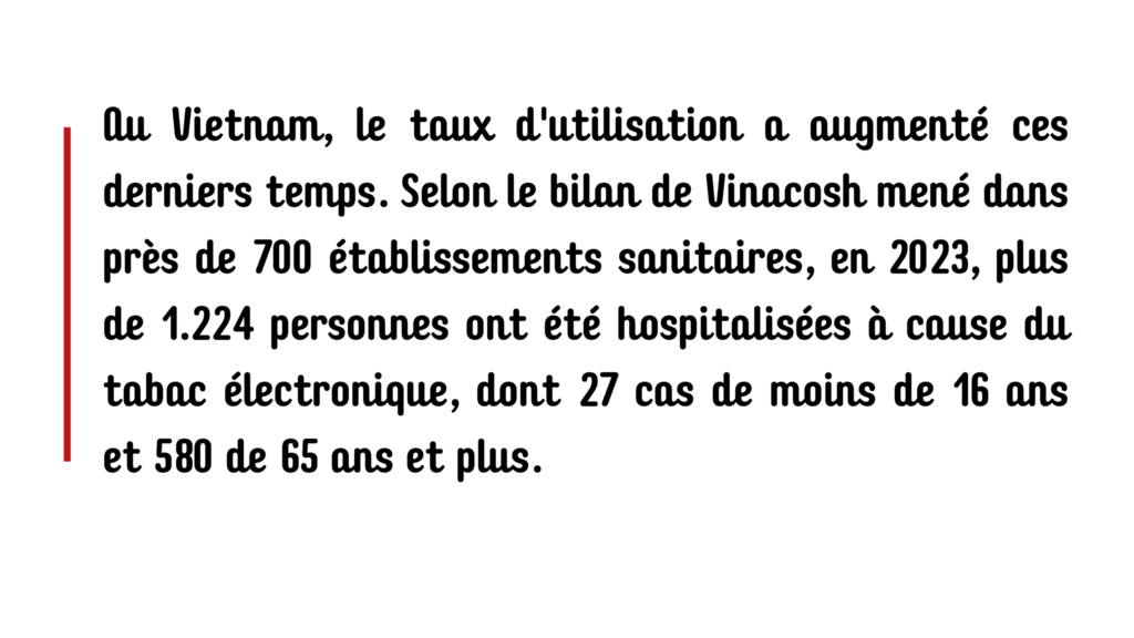 Au Vietnam, le taux d'utilisation a augmenté ces derniers temps. Selon le bilan de Vinacosh mené dans près de 700 établissements sanitaires, en 2023, plus de 1.224 personnes ont été hospitalisées à cause du tabac électronique, dont 27 cas de moins de 16 ans et 580 de 65 ans et plus.