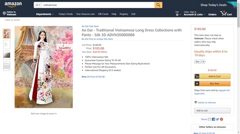 | L’áo dài, tunique fendue traditionnelle des Vietnamiennes, vendu sur l’Amazon. |