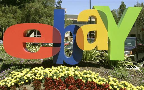 | Le logo eBay devant le siège du groupe à San José, en Californie |