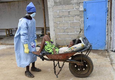 | Un homme pousse une brouette dans laquelle a pris place une femme victime du virus Ebola à l'hôpital de Monrovia (Libéria), le 2 octobre. |