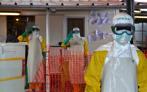 | Des personnels médicaux en combinaison de protection contre le virus Ebola, en 2015 à Conakry, en Guinée. |