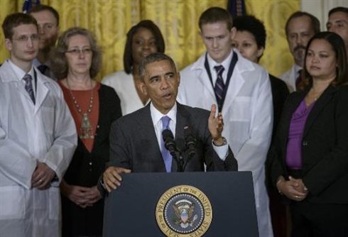 | Des personnels médicaux écoutent le président américain Barack Obama saluer les efforts entrepris dans la lutte contre le virus Ebola, le 29 octobre à la Maison-Blanche à Was |