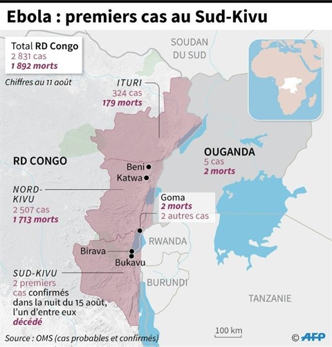 "Nous sommes tristes d'apprendre que deux cas d'Ebola ont été confirmés dans la région du Sud-Kivu. Nous allons y déployer rapidement une équipe d'experts pour appuyer la riposte", a affiché le CICR sur son compte twitter. Déclarée le 1er août 2018, l'épidémie de fièvre hémorragique, qui se transmet par contacts humains directs et étroits et dont le taux de létalité est très élevé, a longtemps été cantonnée aux régions rurales du Nord-Kivu (Beni et Butembo-Katwa) et en Ituri voisine. Deux cas ont néanmoins été enregistrés dans l'Ouganda voisin. La maladie a fait 1.905 morts et 844 personnes ont été déclarées guéries, selon les derniers chiffres publiés par les