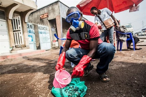 | Un agent sanitaire portant un masque et des gants de protection prépare un mélange désinfectant à base de chlore, le 31 juillet à Goma, en RDC. |