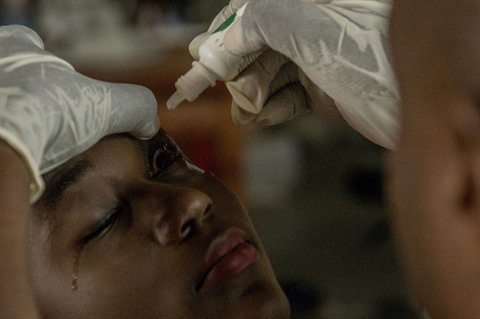 | Examen de l'œil pour vérifier d'éventuelles complications après que cette jeune femme a survécu à Ebola. |