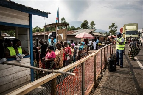 | Une femme se fait prendre la température en franchissant la frontière avec Rwanda, le 16 juillet à Goma, en RDC. |