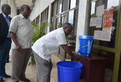 | Le ministre de la Santé du Liberia, Walter Gwanigale (droite), se lave les mains à Monrovia, le 9 août |