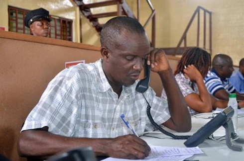 | Un centre d'appels téléphoniques pour améliorer la prévention face au virus Ebola, le 9 août à Monrovia |