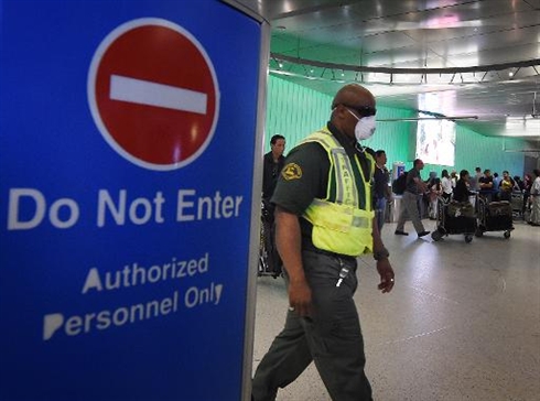 | Un employé de l'aéroport de Los Angeles, le 9 octobre, porte un masque de protection dans la zone des arrivées après l'annonce par les États-Unis d'un renforcement du contrôle des voyageurs en provenance des pays africains touchés par le virus Ebola. Photo : AFP/VNA/CVN |