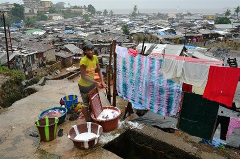 | Dans le bidonville de Kroo à Freetown, capitale de la Sierra Leone, une femme fait la lessive, le 13 août 2014. |
