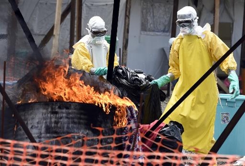 | Des médecins brûlent les vêtements de patients ayant contractés le virus Ebola, le 27 septembre à Monrovia. |